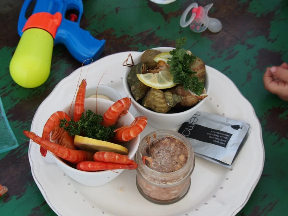 J’ai adoré déguster des huîtres dans les cabanes face au Bassin… Ticoeur et Titpuce ont préféré les crevettes et le pâté local !