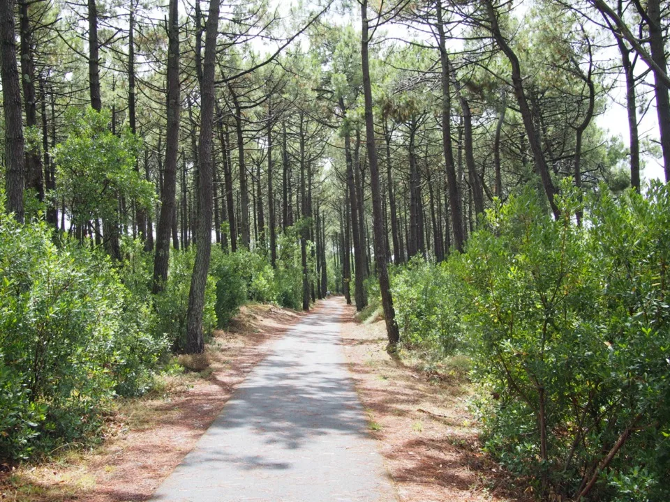 Se déplacer à vélo, même si quelques passages se font sur la route, il y a de beaux chemins à travers les pins.