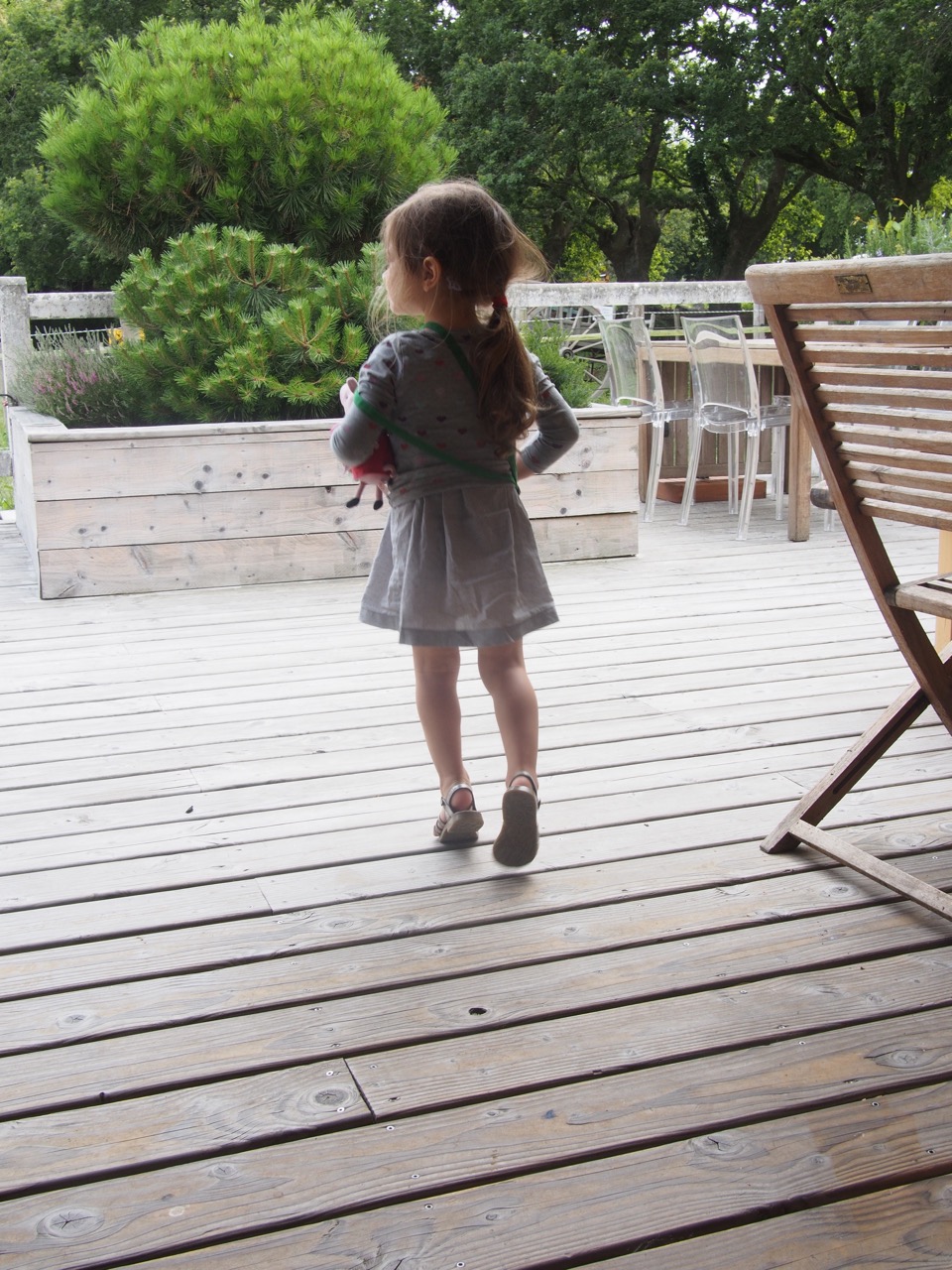 Nous montons le grand escalier-échelle, je referme la trappe derrière les enfants et nous visitons les lieux… Tout d’abord, je craque pour le charme de notre petite terrasse avec vue vers le lointain (la terrasse est sans danger pour les enfants. Vous voyez la balustrade protégée sur la photo).