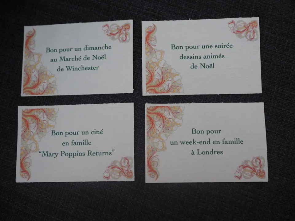 Enfin, comme je vous l’ai dit au début de l’article, je souhaitais que Ticoeur et Titpuce se rappellent nos derniers voyages mais je voulais aussi leur offrir de belles expériences à venir, en famille. Ainsi, dans les valises correspondant aux quatre dimanches de l’Avent j’ai glissé des bons pour une expérience sur le thème de Noël et de l’Angleterre : il y a même de petites escapades au programme !