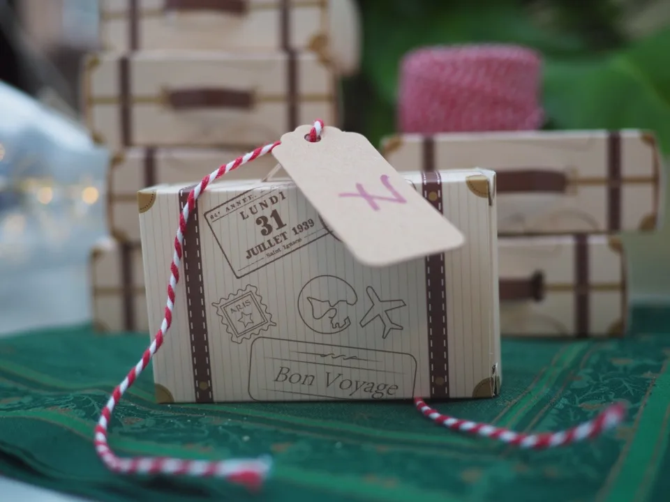 J’ai passé deux heures à préparer les valises (comme pour un vrai voyage !). J’avais commandé un paquet de 50 boîtes au format 8 cm x 5 cm avec un motif valise (boîtes dénichées sur Amazon). Il a fallu les plier, les monter, mettre la poignée, nouer les étiquettes, remplir…