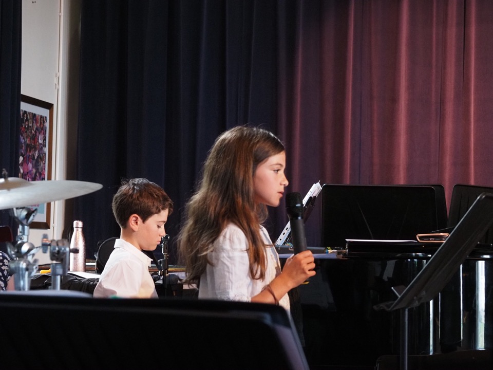 Puis mon père est arrivé pour passer une semaine avec nous et lui, qui aime tant la musique, (les chats ne font pas des chiens !) a eu la chance d’être ici pour le gros concert de l’école. Il y avait déjà eu de nombreuses soirées-concerts à l’école mais jamais Titpuce n’a voulu participer pour un solo (dans la chorale, pas de soucis…) alors qu’elle prend des cours de chant et adore chanter ! Elle a trop peur du public contrairement à Ticoeur qui est très à l’aise sur scène et joue souvent du piano. Bref, jusqu’au bout, je me suis demandée si elle allait se lancer… Ce qui l’a aidée à se décider ? Ticoeur lui a proposé d’être à côté d’elle et de l’accompagner au piano. Ils ont une telle complicité ces deux-là ! La stratégie d’équipe grand frère-petite sœur a parfaitement fonctionné ! Titpuce a super bien chanté, elle a combattu son trac et le public a été conquis par sa voix si douce ! Évidemment, ils ont chanté du Billie Eilish : No Time to Die, la chanson du dernier James Bond…
