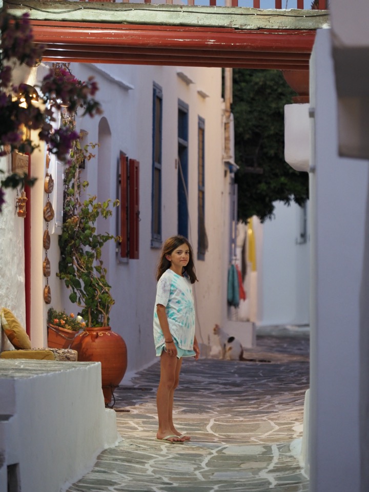 Côté restaurant, nous avons adoré manger chez Kaptain George, tenu par une famille de pêcheurs installée tout en bas de Kastro, dans cette crique où Ticoeur est en train de s’amuser dans les vagues :