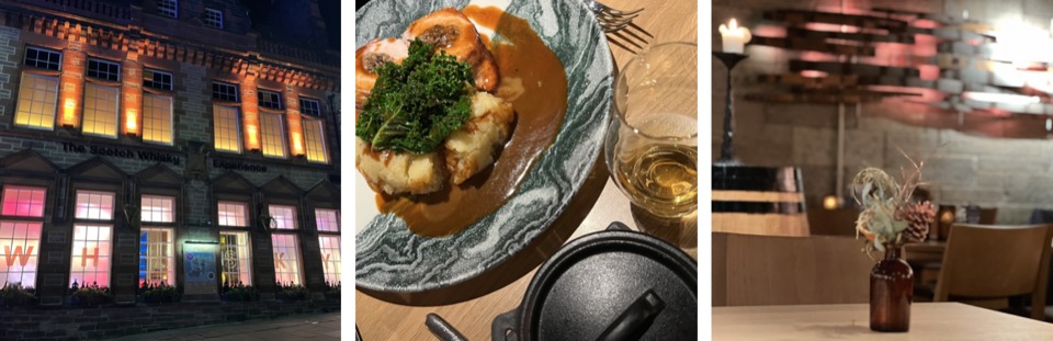 Amber ❤ : il s’agit du restaurant de la distillerie-musée The Scotch Whisky Experience. Pour un voyage en solo avec ma petite ado, la visite de la distillerie n’aurait pas eu d’intérêt pour elle. Par contre, j’avais repéré leur restaurant qui propose une cuisine écossaise gastronomique à un bon rapport qualité-prix pour le Royal Mile. Ma Titpuce y a goûté du haggis enroulé dans du poulet (sur la photo) et elle a beaucoup aimé (pourtant le haggis c’est très spécial !). J’ai opté pour une petite casserole de moules locales et j’ai quand même pu profiter indirectement de ce musée du whisky en choisissant l’une des 500 références de leur carte ! On peut juste commander un petit verre de dégustation : c’était parfait pour cette expérience de dîner 100% écossais.