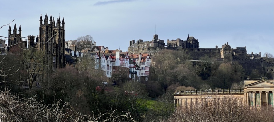 A côté de la Fontaine Ross, se trouve la Scottish National Gallery (gratuite) et sa collection de tableaux classiques si cela vous tente un jour de pluie. Ce n’était pas sur notre programme. C’est le bâtiment en bas à droite sur la photo. De là, on a également une belle vue sur le New College et ses tours à gauche et le château dans le fond.