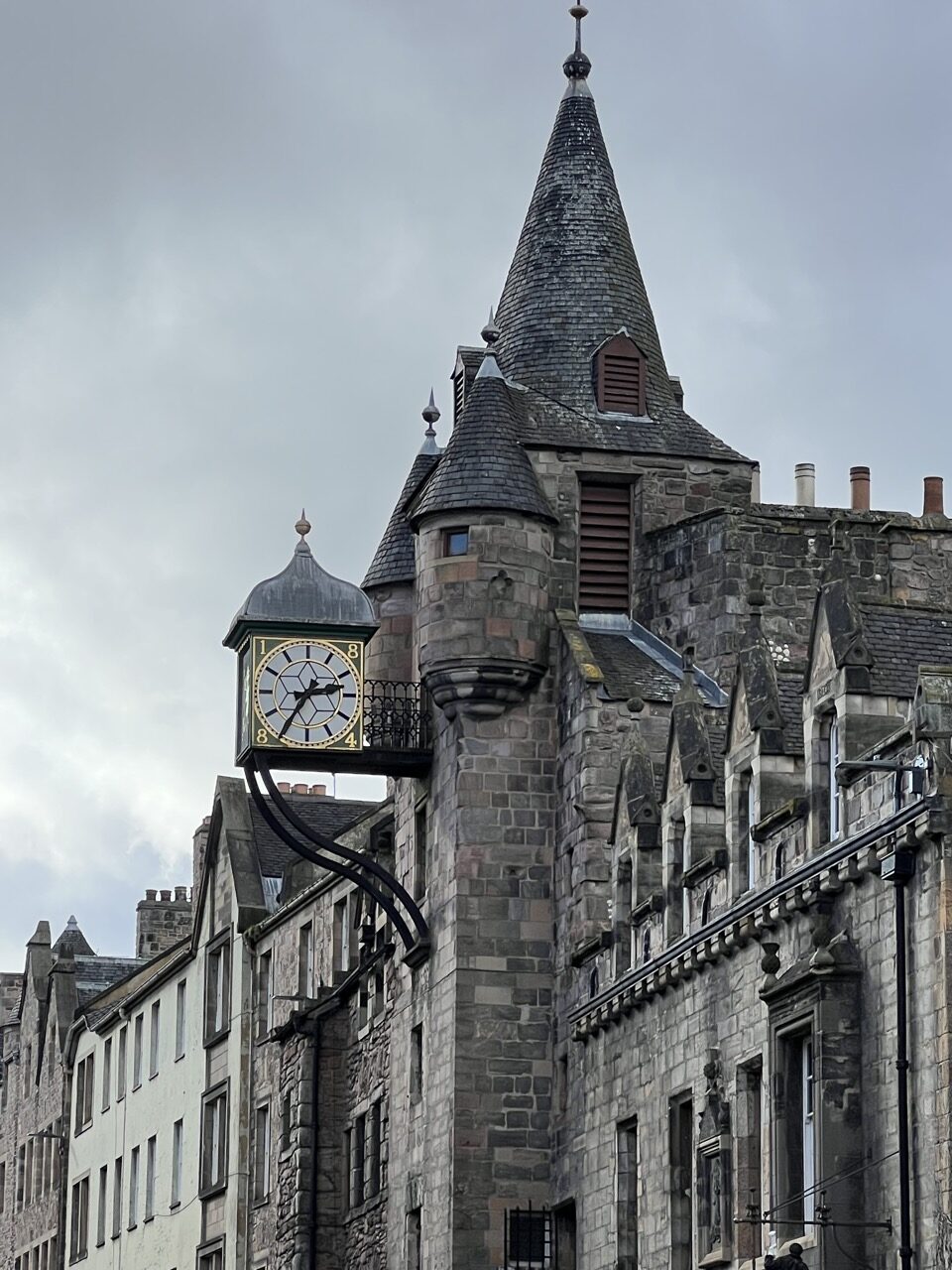 La partie est du Royal Mile s’appelle Canongate. On y croise notamment ce bâtiment médiéval, le Canongate Tolbooth, bâtiment administratif et prison du Moyen-Age, avec son horloge et ses tourelles.