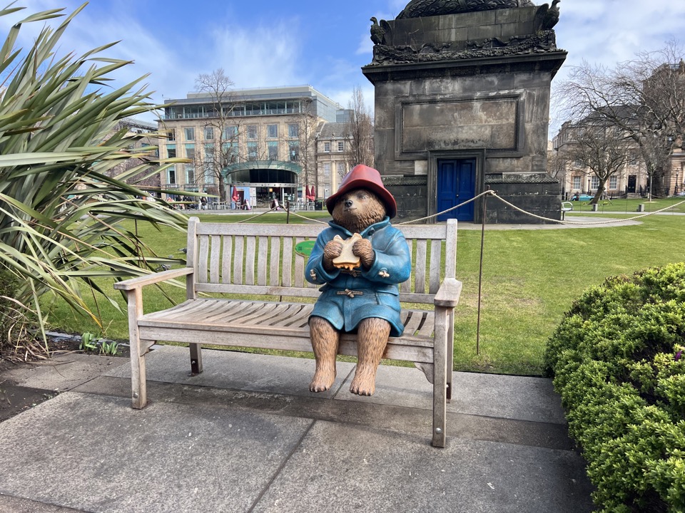 Les rues de New Town forment un damier et les constructions sont principalement d’architecture géorgienne (de l’époque des rois George). C’est un style que j’aime beaucoup. Pour l’admirer, il suffit de se balader dans les principales rues comme George Street, Rose Street et les places telles que Charlotte Square ou St Andrew Square où nous avons croisé Paddington ! Figurez-vous que mon ado n’était plus intéressée pour poser avec lui sur la photo :-).